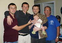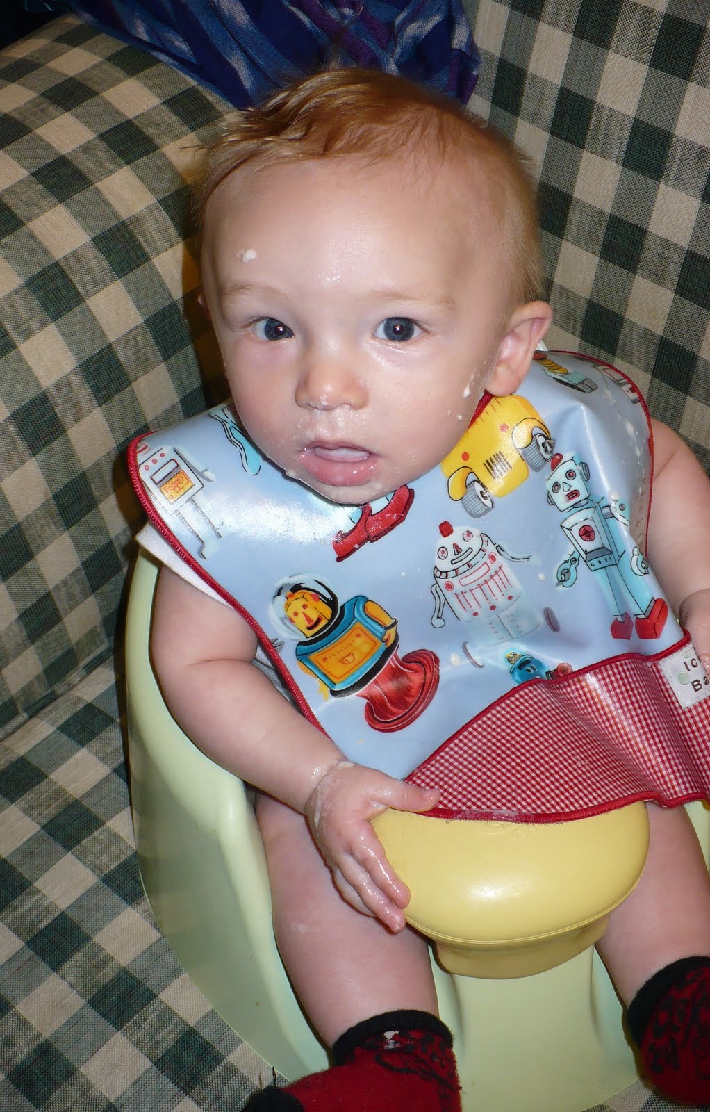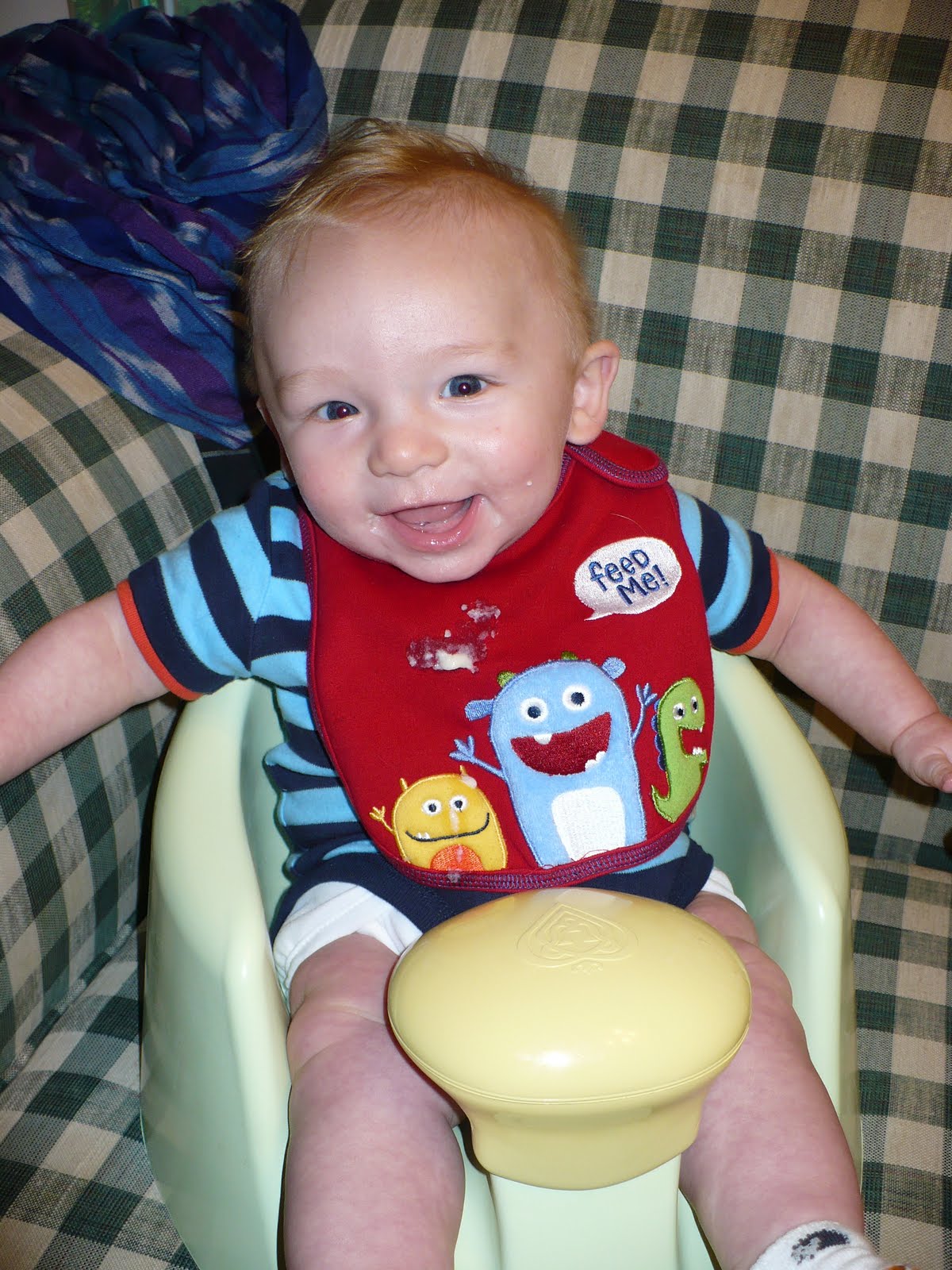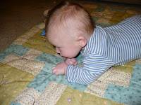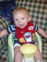 This is Gabriel with zucchini on his face. It's his favorite vegetable - also the first one we tried. He just loves it. He's not making a super happy face right here, but that's mainly the effect of the camera, not the food. So, yes, we are eating veggies now, so far just zucchini and carrots. We just started the carrots a few days ago, but we've been doing zucchini for a couple of weeks. And we've given up on rice cereal. It is just too boring. Now we're eating oatmeal instead, and later this week we'll try a multi-grain cereal. Gabriel is also getting better at drinking water, both out of a real cup and a sippy cup. Yesterday I gave him diluted juice for the first time. One of the moms in my PEPS group suggested pear juice for constipation, so that's what we're trying. When I mentioned constipation in the last post, I was being naive - he was not constipated then. Now I know the difference! So anyway, hopefully the juice will help . . .I don't really have any pictures this week unfortunately, my camera needs batteries before I can get any new ones from it to the computer. Fun things are happening besides vegetables though . . . we've discovered clapping!! Clapping is Gabriel's new favorite thing. And it really is the cutest thing in the world to see. I've started doing some baby signs with him, and now we're working on waving. He just loves doing things with his hands, and watching my hands. He also LOVES getting into EVERYTHING!! He can't even crawl, yet he manages to get into everything within reach, and many things that are just barely out of reach. He is working really hard on figuring out this crawling thing, so we really need to start paying attention to what's around him. I think Gabriel is going to be a very very entertaining (and a little bit difficult) little mover!
